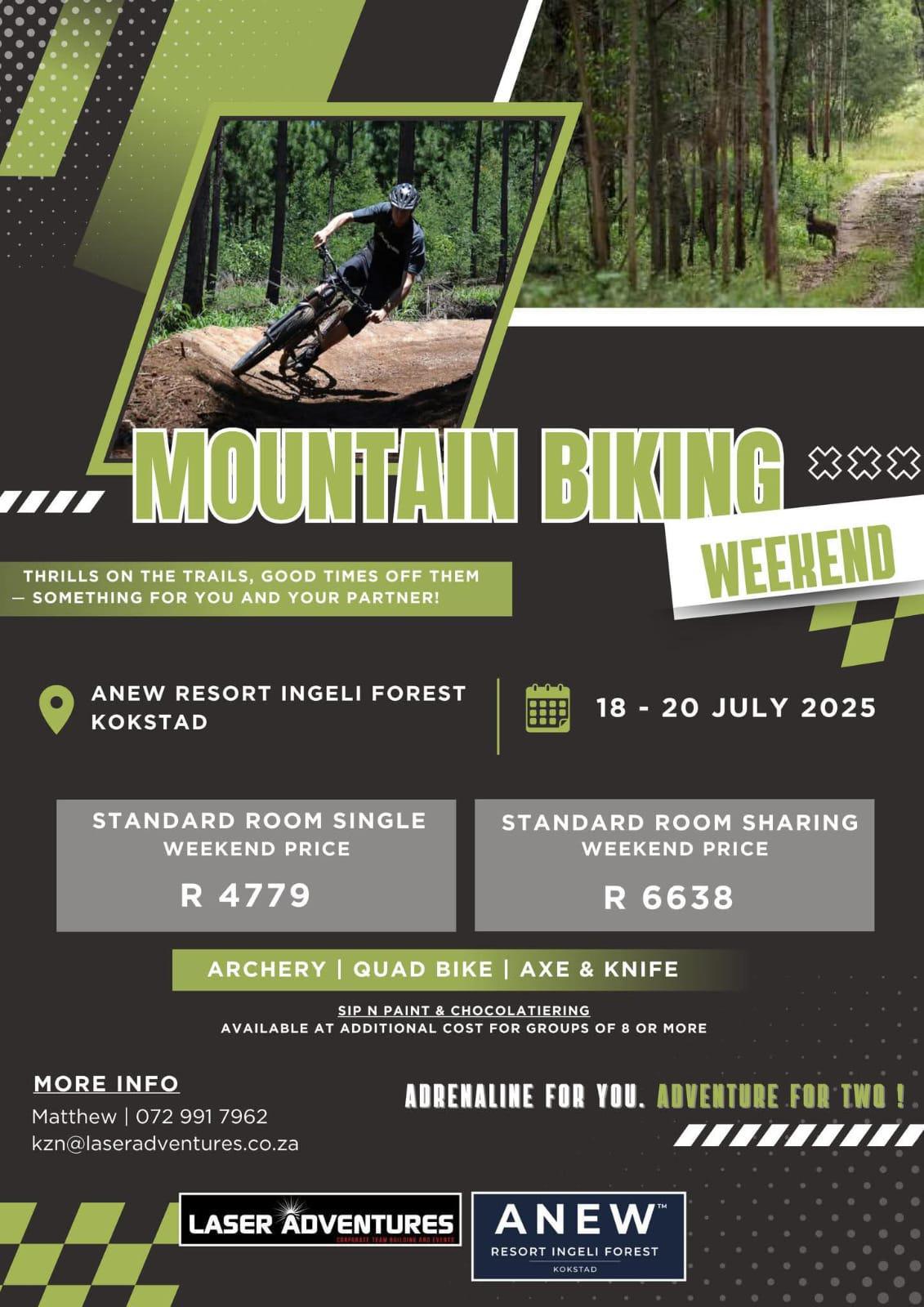 Join Laser Adventures KZN at ANEW Resort Ingeli Forest Kokstad 18 - 20 July 2025 for an all-out mountain biking weekend, filled with riding, quad biking, archery, and axe throwing.