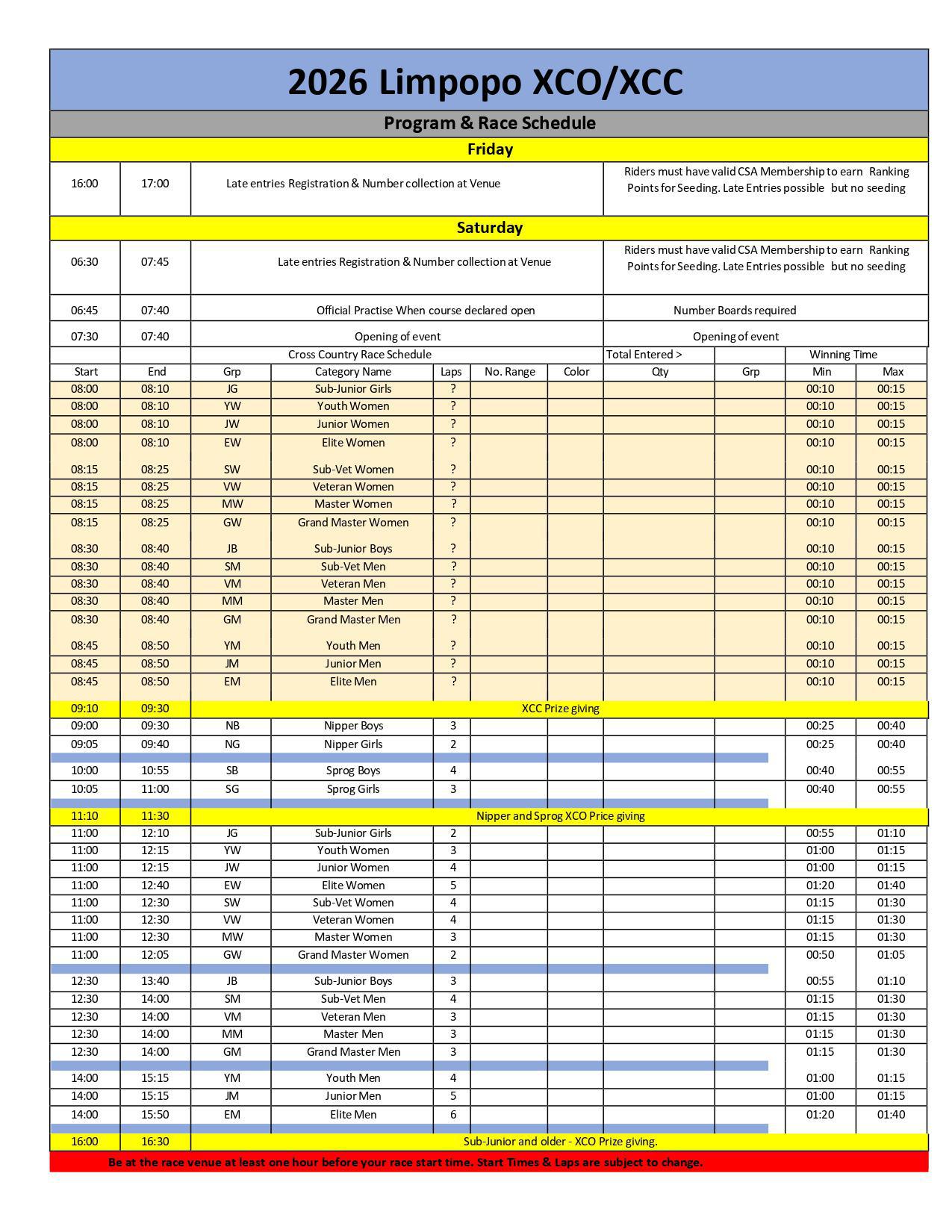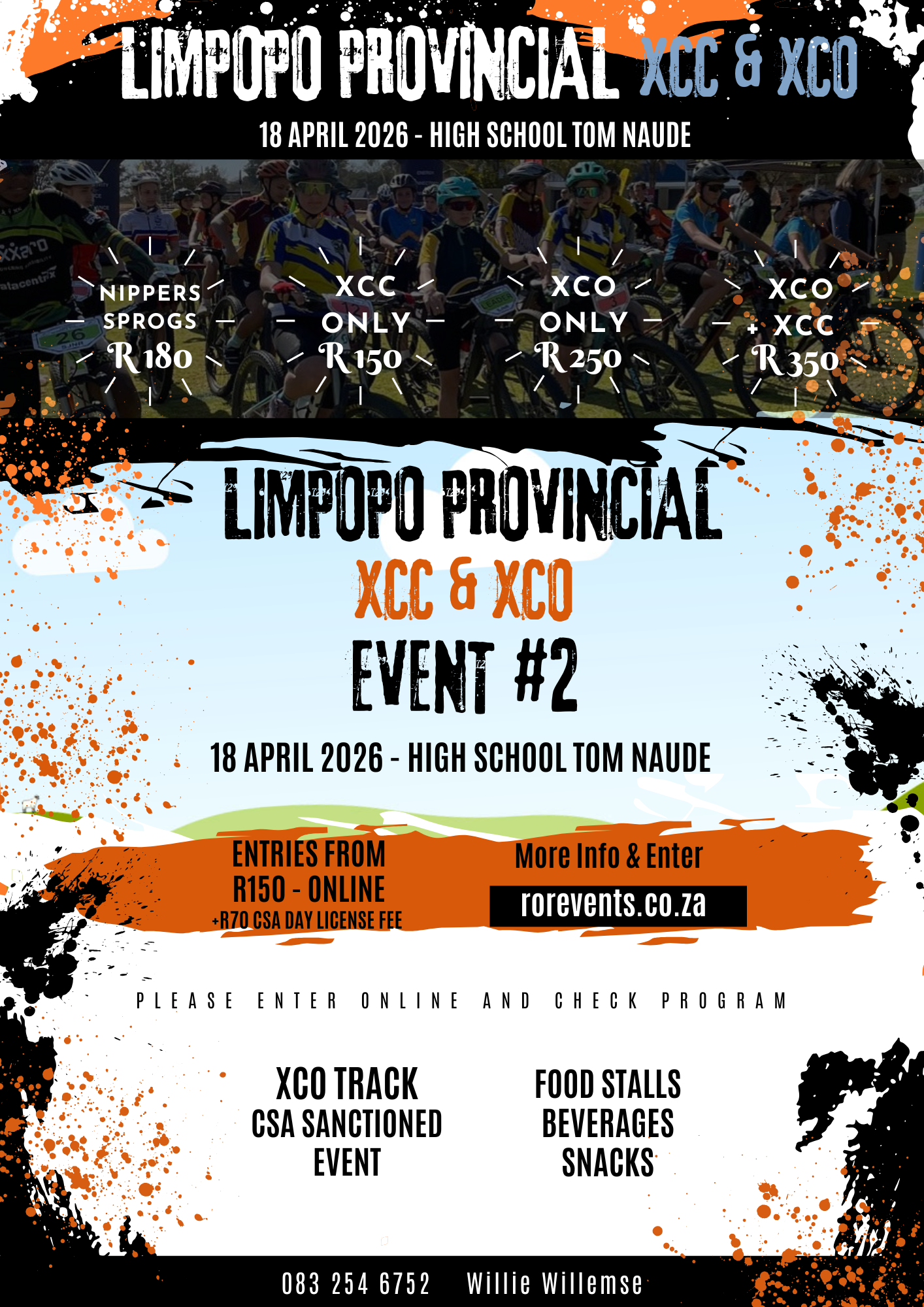 | R180 - Ages 8-12 | R150 - XCC ONLY ages 13+ | R250 - XCO ONLY ages 13+ | R350 - XCC + XCO ages 13+ |